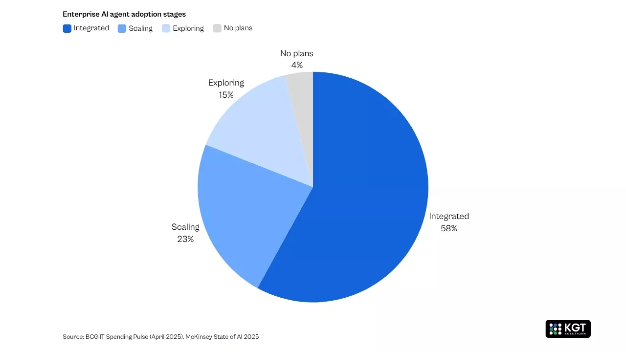 Agentic AI does not wait for instructions. It monitors sensor feeds, catches anomalies, adjusts machine parameters, and reroutes production schedules on its own. According to a BCG survey from April 2025, 58% of companies have already integrated AI agents into their operations, and another 35% are actively exploring them.