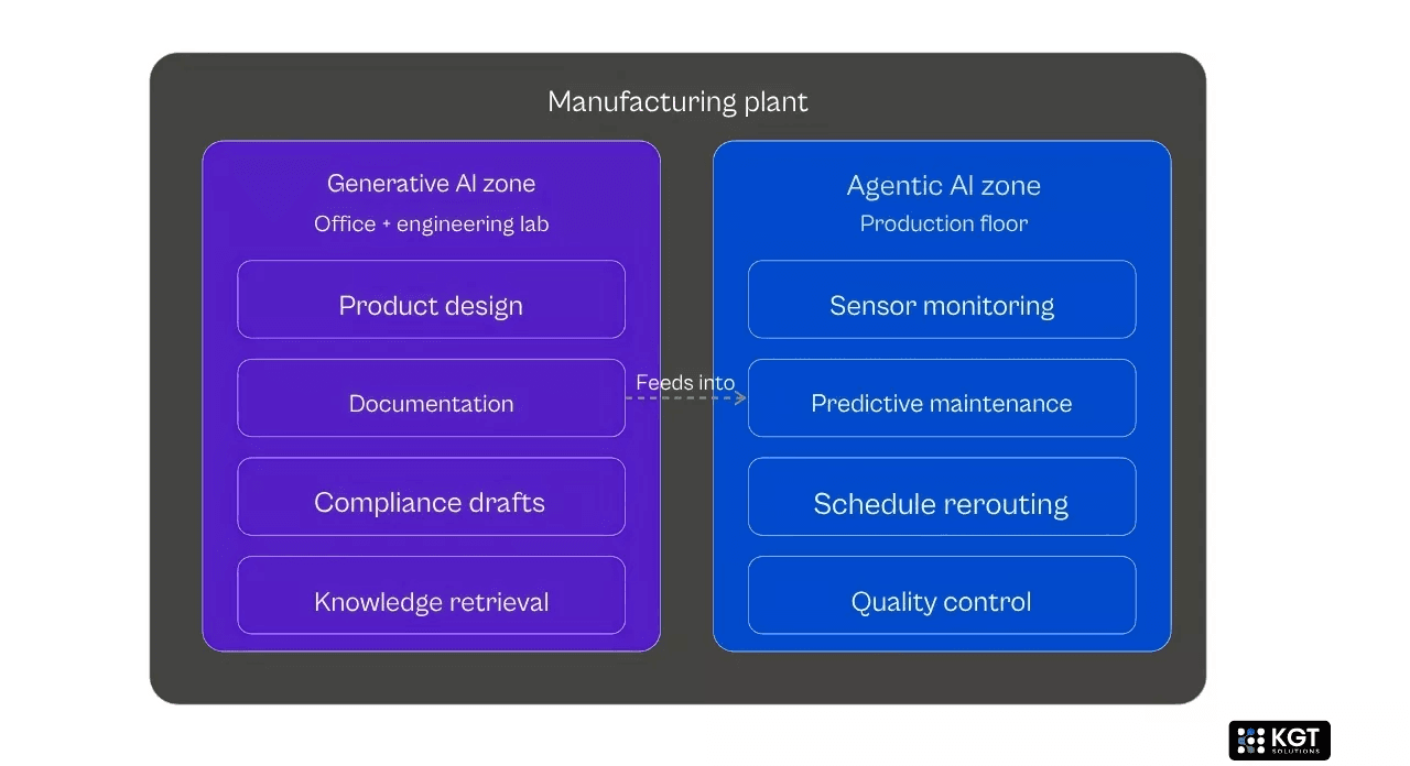 Generative AI belongs in the office and the engineering lab. Agentic AI belongs on the production floor. That is an oversimplification, but it is directionally right.