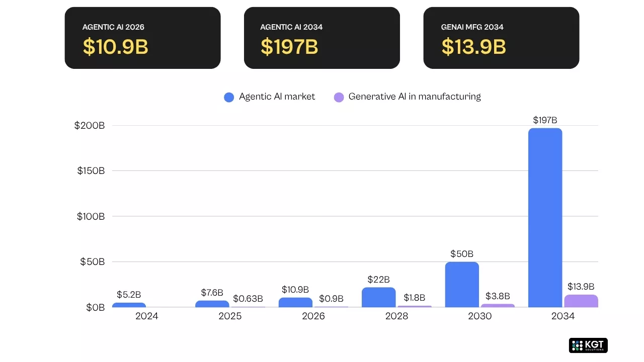 Agentic AI operates autonomously to make decisions, coordinate actions, and execute multi-step workflows without waiting for a human prompt. Generative AI creates content, summaries, code, or designs in response to a specific request. The agentic AI market alone is projected to hit $10.86 billion in 2026, growing at a 43.8% CAGR toward $196.6 billion by 2034, according to Precedence Research. That is not speculative growth. That is capital being reallocated from manual processes.