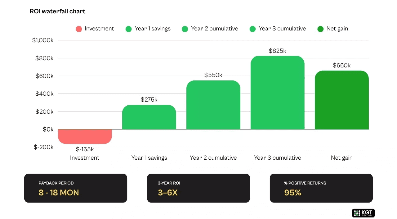 This is where industrial automation ROI compounds. Each sensor-equipped asset feeds better training data into the system. After 24 to 36 months, mature deployments reach 70 to 75 percent downtime reduction from equipment failures, according to Deloitte and McKinsey benchmarks.