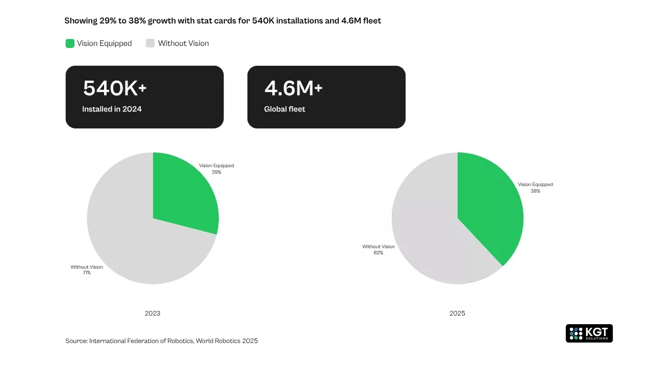 Vision-equipped robots hit 38% of all new installations in 2025, up from 29% in 2023. Over 540,000 units were installed globally in 2024, pushing the operational fleet past 4.6 million.