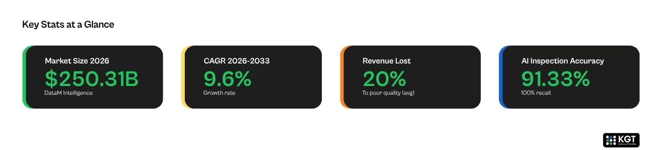 The average manufacturing company loses about 20% of revenue to poor quality costs, according to Overview.ai. On a $10 million line, that's $2 million gone to scrap, rework, and warranty claims. Automation attacks this problem at the source.