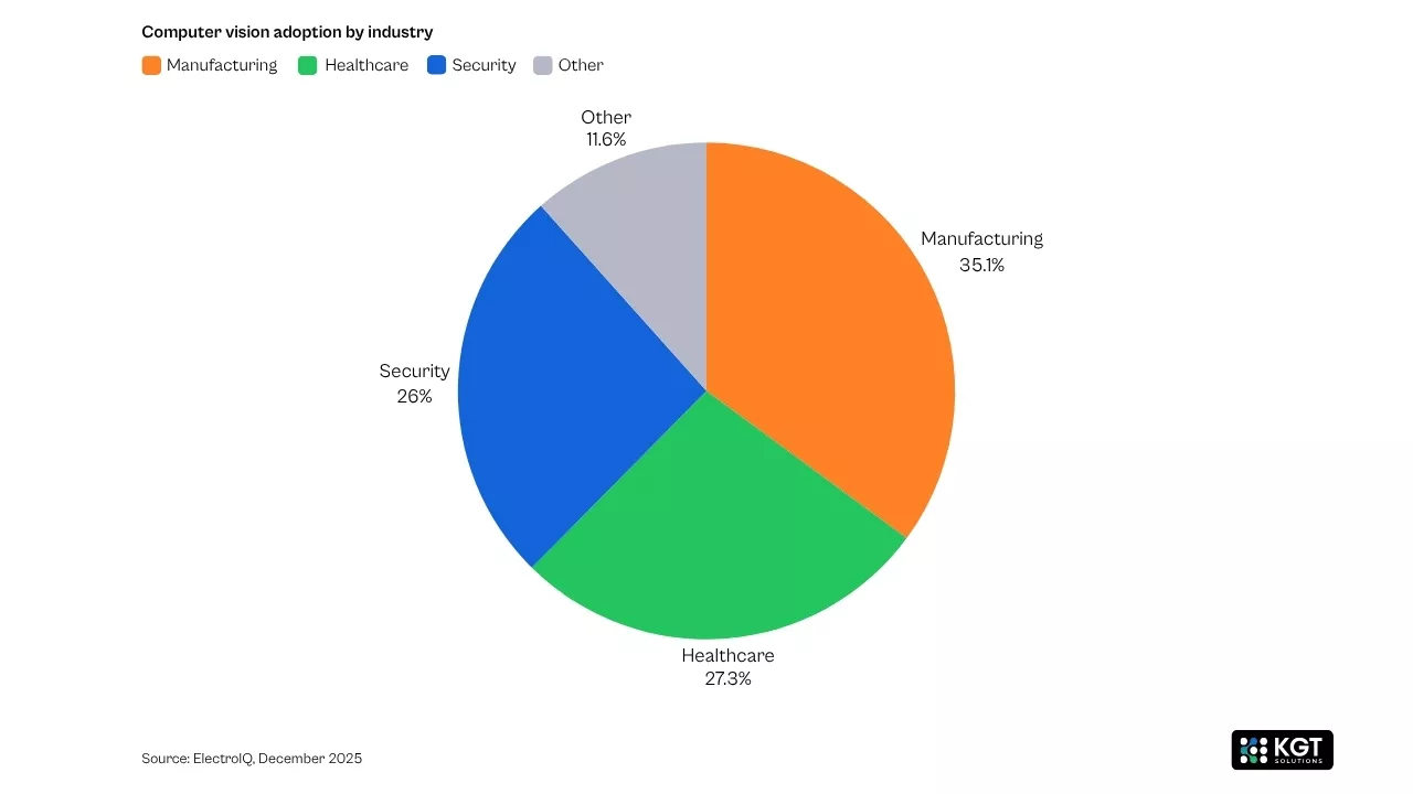 The inspection and quality assurance application commanded 41.08% of total market revenue in 2025 (Mordor Intelligence). Manufacturing accounts for 35.1% of computer vision adoption (ElectroIQ), healthcare follows at 27.3%, security at 26%. These are fields where missing one anomaly has real consequences.