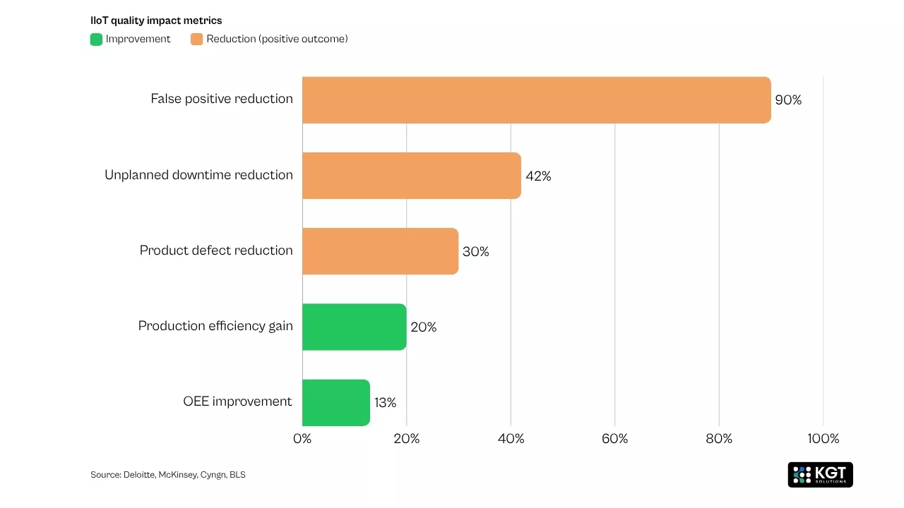 A German automotive manufacturer that implemented IIoT-based quality monitoring reduced product defects by 30% and increased production efficiency by 20% through real-time adjustments (GlobalLogic). Manufacturing facilities using edge-deployed neural networks for quality control have cut false positives in defect detection by up to 90% compared to manual inspection (World Journal of Advanced Engineering Technology and Sciences, 2025).
