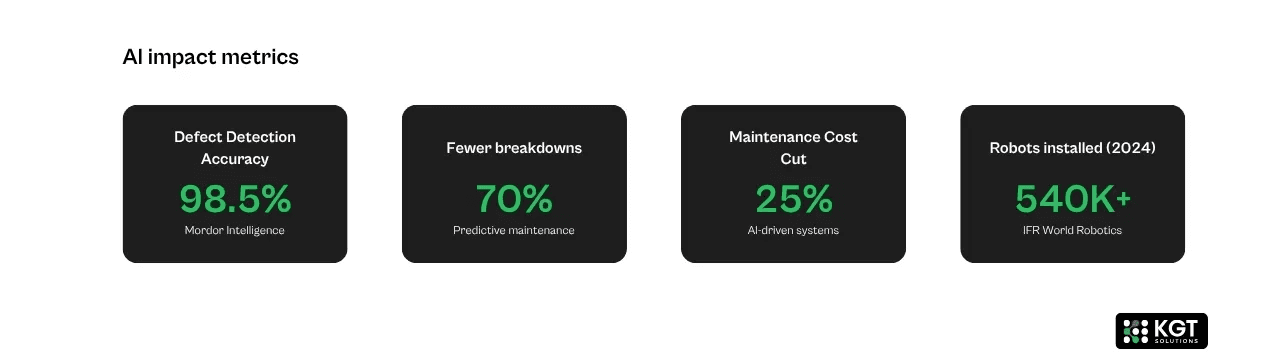 The AI in manufacturing market is projected to expand from $34.18 billion in 2025 to $155.04 billion by 2030 at a 35.3% CAGR. AI-driven defect detection achieves up to 98.5% accuracy, predictive maintenance cuts machinery costs by 25%, and reduces breakdowns by 70%. Intel reported saving $2 million annually through its AI inspection system.