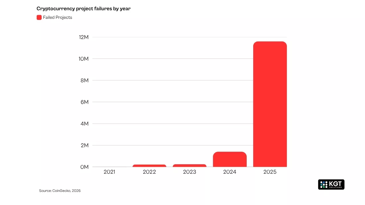 Most blockchain projects die. That's not pessimism, it's arithmetic. CoinGecko's 2026 data shows that 53.2% of the roughly 20.2 million tokens launched since 2021 have already stopped trading. In 2025 alone, 11.6 million projects collapsed, accounting for 86.3% of all recorded failures in the five-year window (CoinGecko, 2026). Meanwhile, Crunchbase numbers suggest that 80% of blockchain startups fold within their first three years.