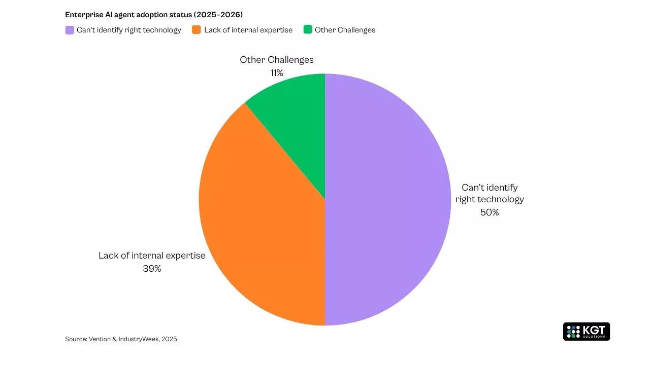 39% of manufacturers cite a lack of internal expertise as a top reason their automation projects underperform, per the Vention/IndustryWeek survey. And 50% say they struggle to even identify the right technology to deploy.
