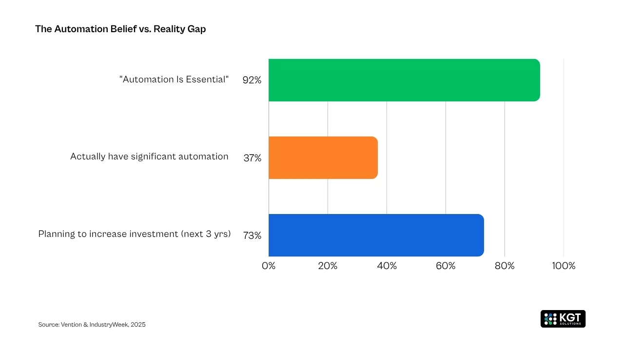 According to a 2025 Vention and IndustryWeek report, 92% of manufacturers say automation is essential for long-term competitiveness, yet only 37% report having significant or full automation in place. That gap tells you something important: the problem isn't willingness to automate. It's how companies go about it.