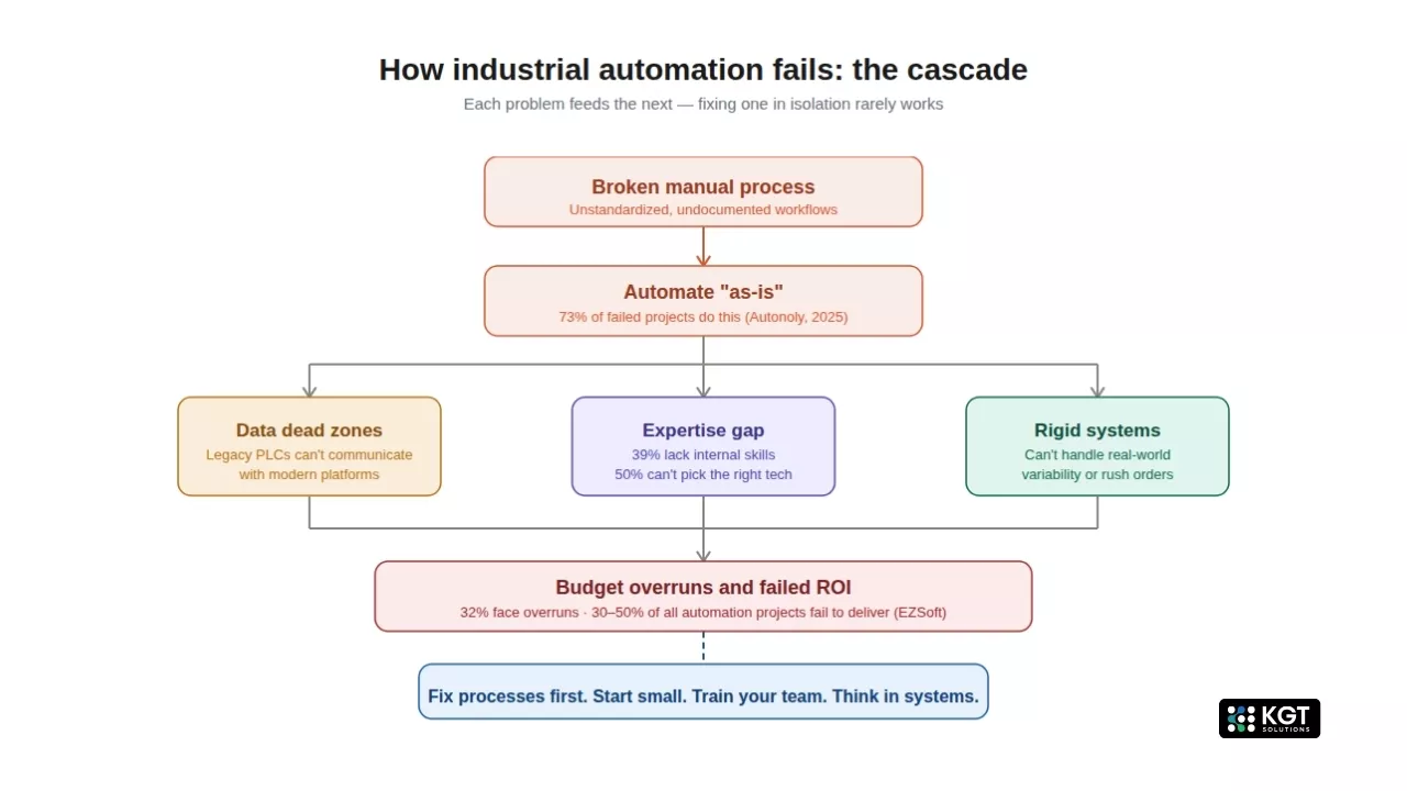 Industrial automation fails most often because companies automate broken processes instead of fixing them first. Research from Autonoly found that 73% of failed automation projects failed precisely because organizations digitized dysfunction rather than designing better workflows before adding technology. A bad manual process doesn't become a good automated one. It becomes a bad process that runs faster and breaks at scale.