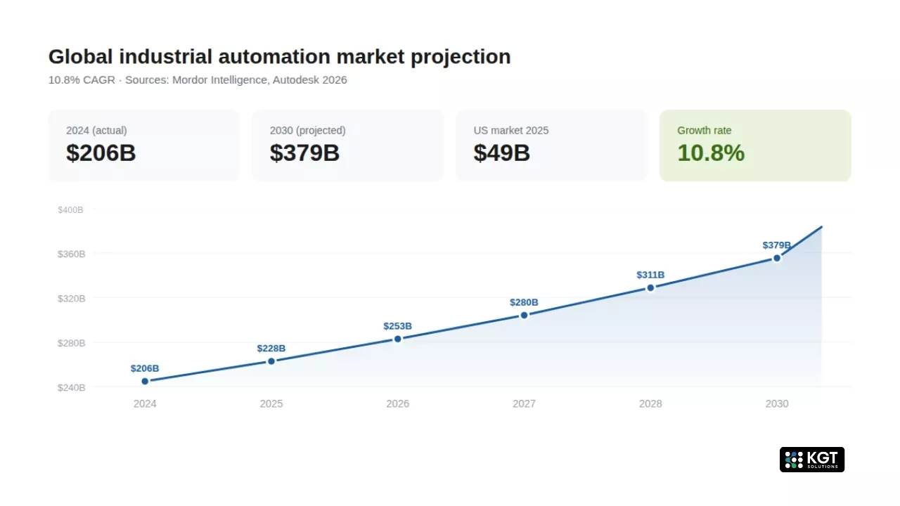 The global market for factory automation is projected to reach $378.57 billion by 2030, growing at 10.8% CAGR from $206.33 billion in 2024. Companies pouring money into this expansion need to spend at least as much on planning and integration as on equipment. The ones that don't end up with expensive islands of technology that never connect into a useful whole.